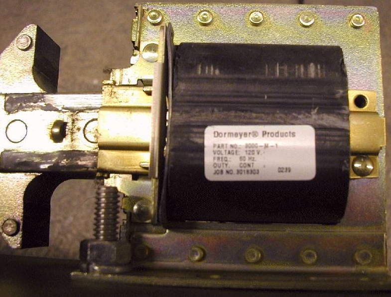 The pictures above and below show how the linking bar is held by the solenoid. The solenoid is mounted to the back of a rectangular shield placed at the upper left corner of the bay. These views are from the back.